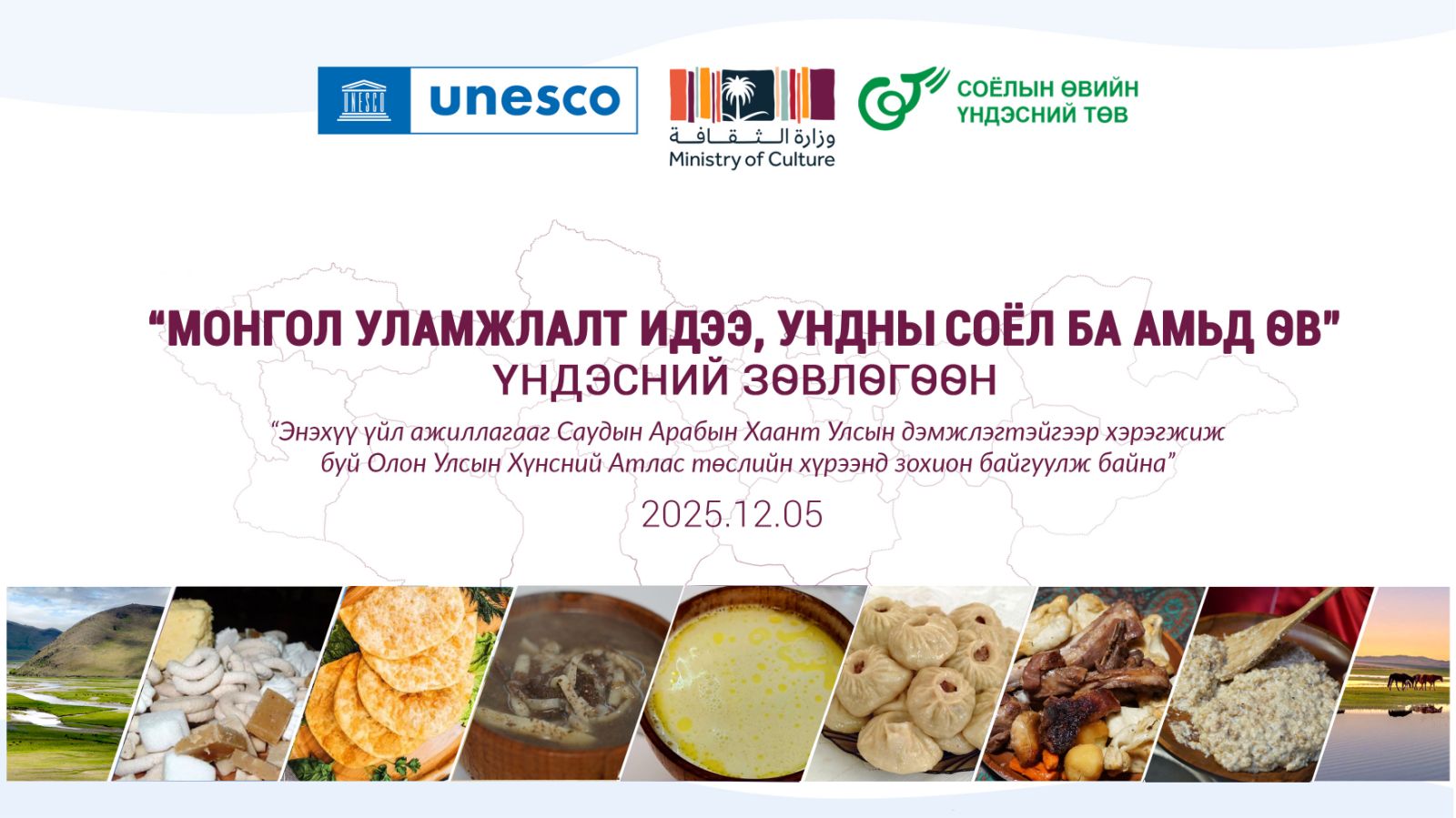 Монголын уламжлалт идээ, ундааны соёлыг хамгаалах, түгээн дэлгэрүүлэх, ирээдүй хойч үед өвлүүлэн уламжлуулах, салбар хоорондын хамтын ажиллагааг бэхжүүлэх зорилгоор ЮНЕСКО-ийн “Соёл ба дижитал технологи” хөтөлбөрийн хүрээнд хэрэгжиж буй “Хоол хүнсний өв соёлыг хамгаалах, сурталчлах олон улсын хоолны атлас ба дижитал платформ” төсөлтэй уялдуулан үндэсний хэмжээнд зөвлөгөөн зохион байгуулав.