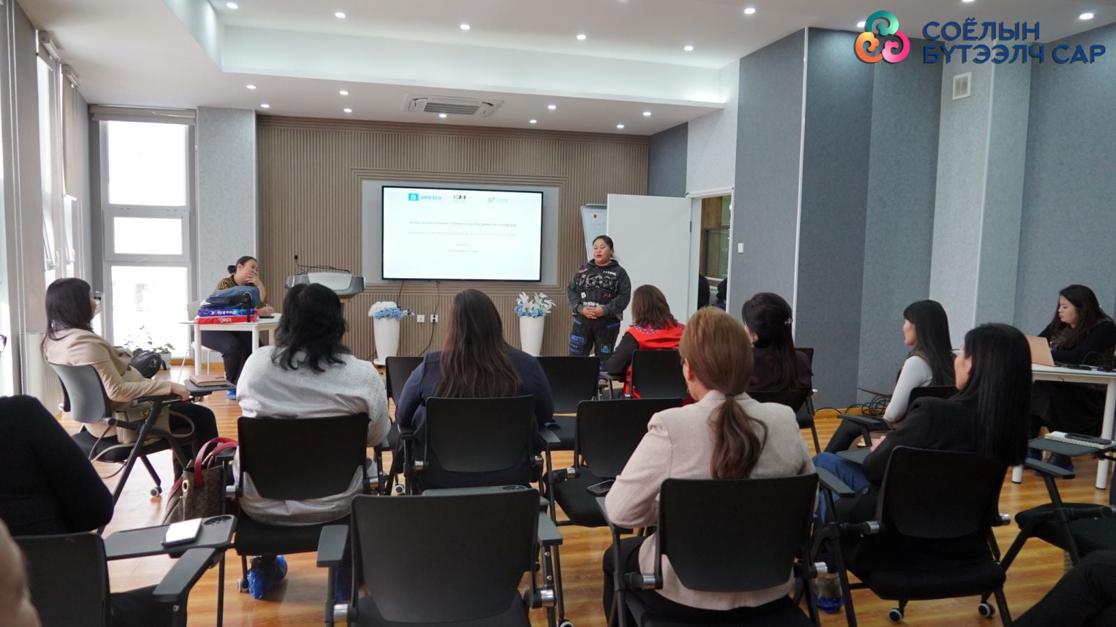 “Соёлын бүтээлч сар” аяны хүрээнд зохион байгуулж буй энэхүү чадавх бэхжүүлэх сургалтыг Соёл, спорт, аялал жуулчлал, залуучуудын яамны Соёлын биет бус өвийн асуудал хариуцсан мэргэжилтэн, ЮНЕСКО-ийн итгэмжлэгдсэн зөвлөх багш Ц.Цолмон, Соёлын өвийн үндэсний төвийн Бүртгэл, мэдээллийн газрын дарга, ЮНЕСКО-ийн итгэмжлэгдсэн зөвлөх багш А.Саруул нар чиглүүлэн явуулж байна.