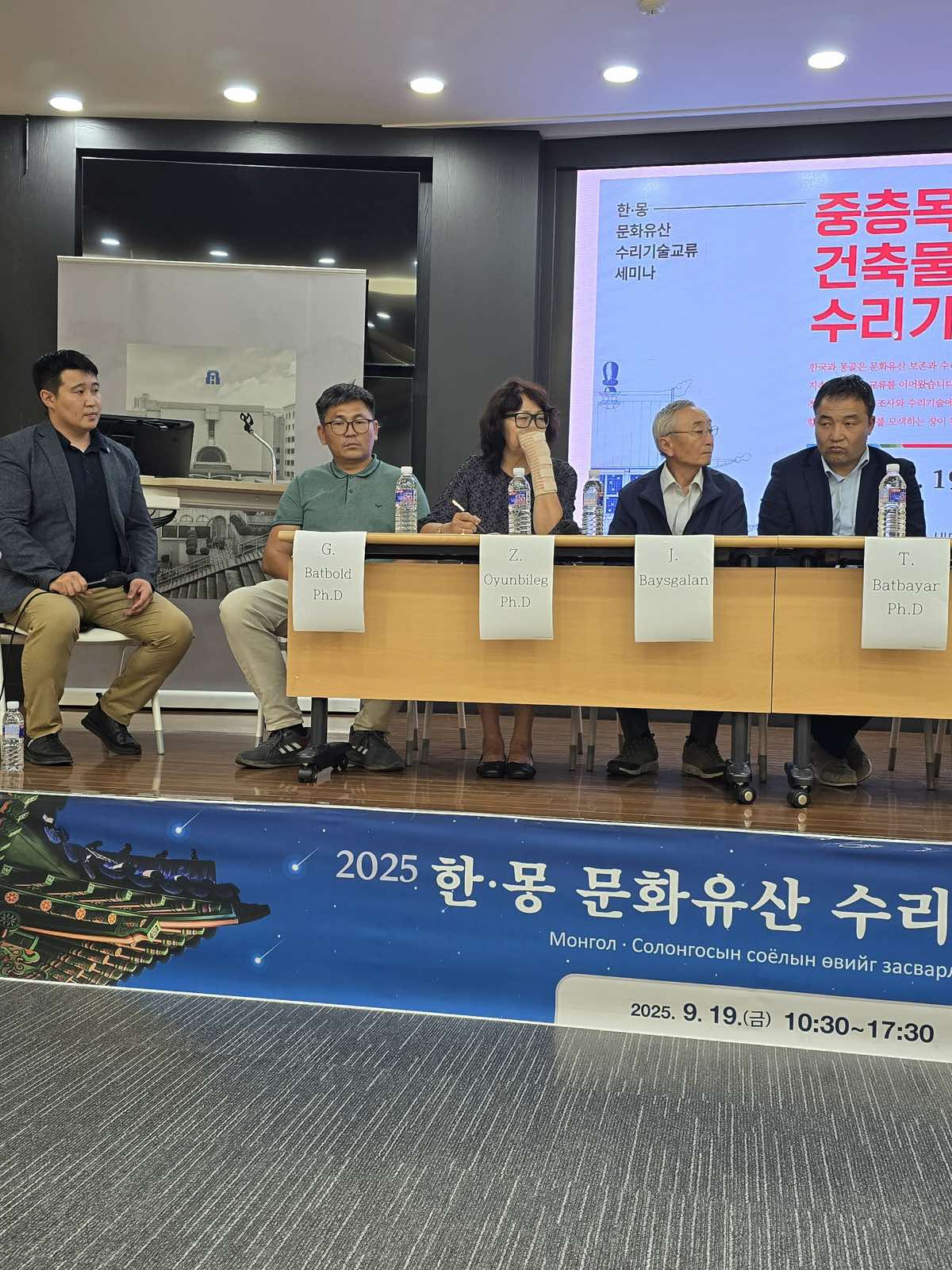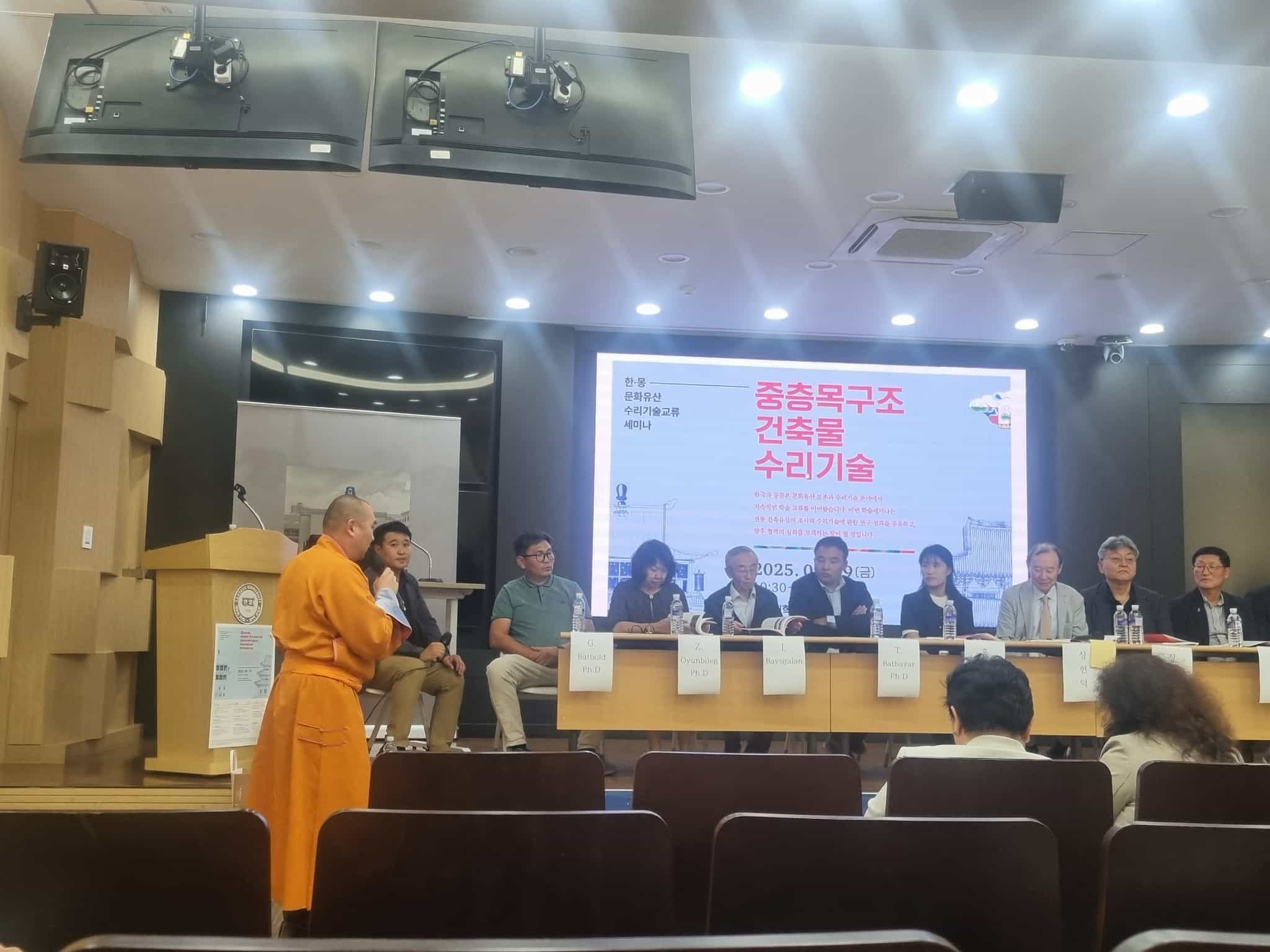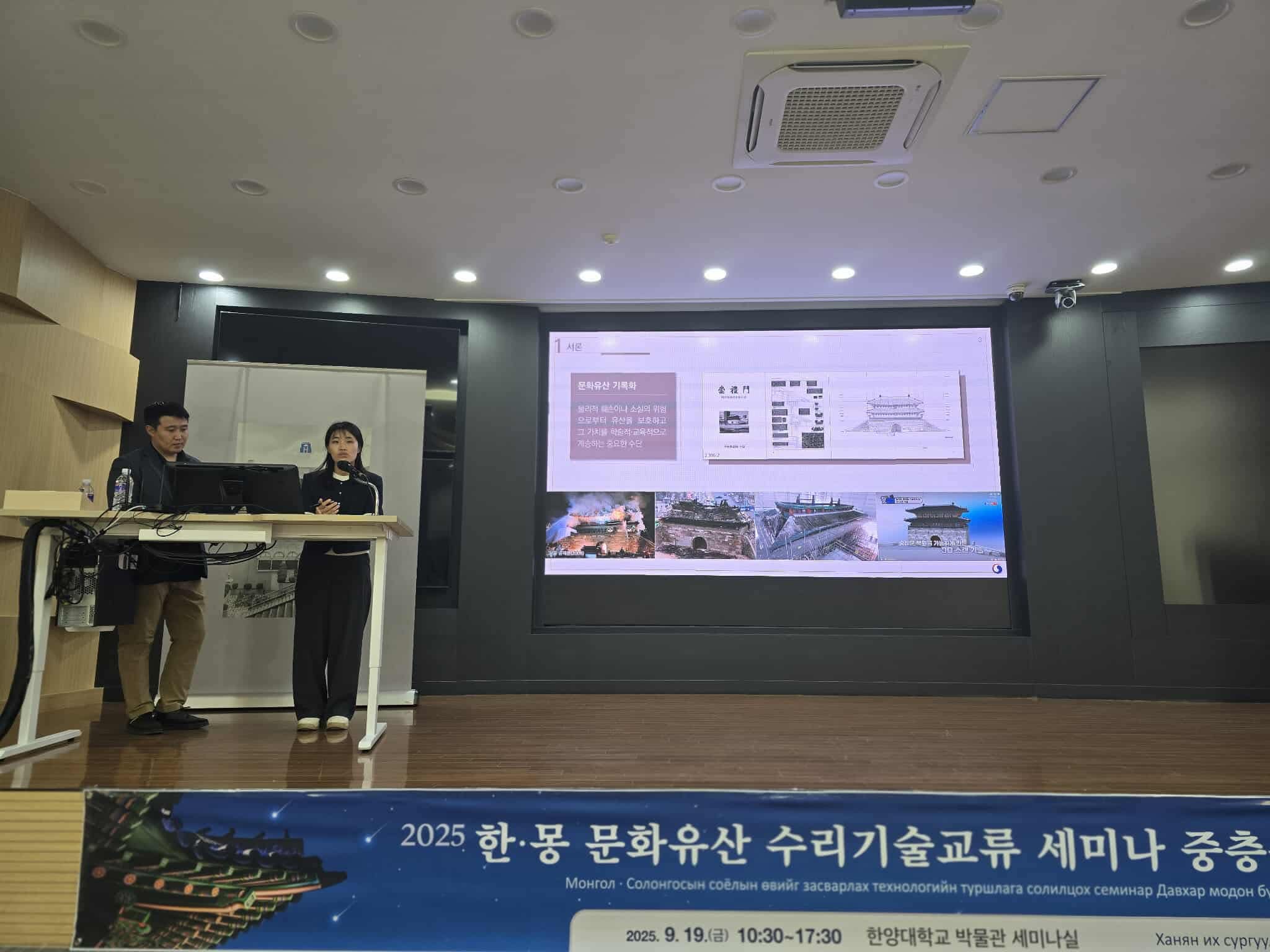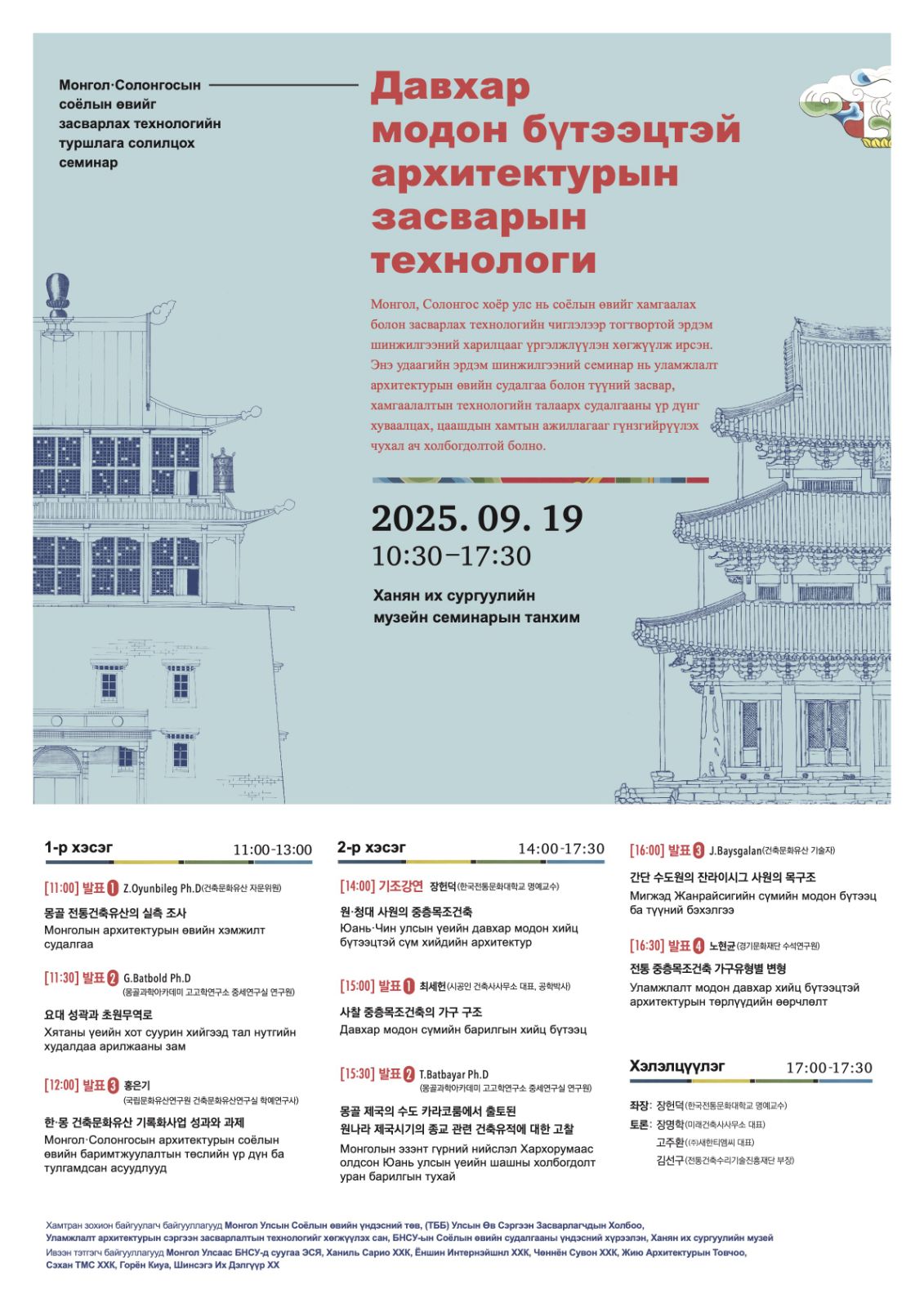 Соёлын өвийн үндэсний төвийн Түүхэн дурсгалт барилга, архитектурын дурсгалыг хамгаалах газраас БНСУ-ын Соёлын өвийн судалгааны үндэсний хүрээлэнгээс санаачлан “ДАВХАР МОДОН БҮТЭЭЦТЭЙ АРХИТЕКТУРЫН ЗАСВАРЫН ТЕХНОЛОГИ’’ сэдэвт Монгол-Солонгосын архитектурын өвийг засварлах технологийн туршлага солилцох эрдэм шинжилгээний хурал 2025 оны 09 дүгээр сарын 19-ний өдөр БНСУ-ын Сөүл хотын Ханян (Hanyang) их сургуулийн музейн хурлын танхимд зохион байгууллаа.