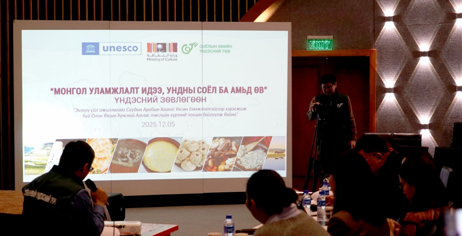 Монголын уламжлалт идээ, ундааны соёлыг хамгаалах, түгээн дэлгэрүүлэх, ирээдүй хойч үед өвлүүлэн уламжлуулах, салбар хоорондын хамтын ажиллагааг бэхжүүлэх зорилгоор ЮНЕСКО-ийн “Соёл ба дижитал технологи” хөтөлбөрийн хүрээнд хэрэгжиж буй “Хоол хүнсний өв соёлыг хамгаалах, сурталчлах олон улсын хоолны атлас ба дижитал платформ” төсөлтэй уялдуулан үндэсний хэмжээнд зөвлөгөөн зохион байгуулав.