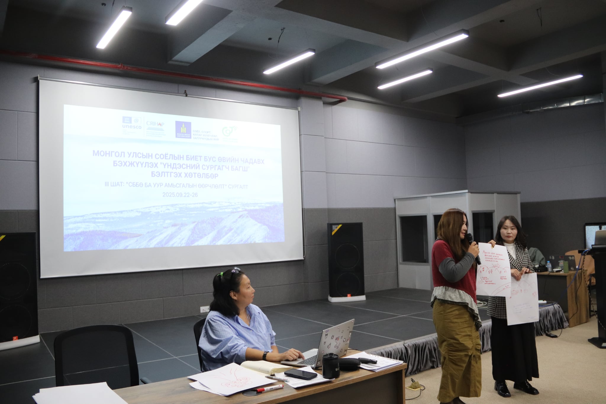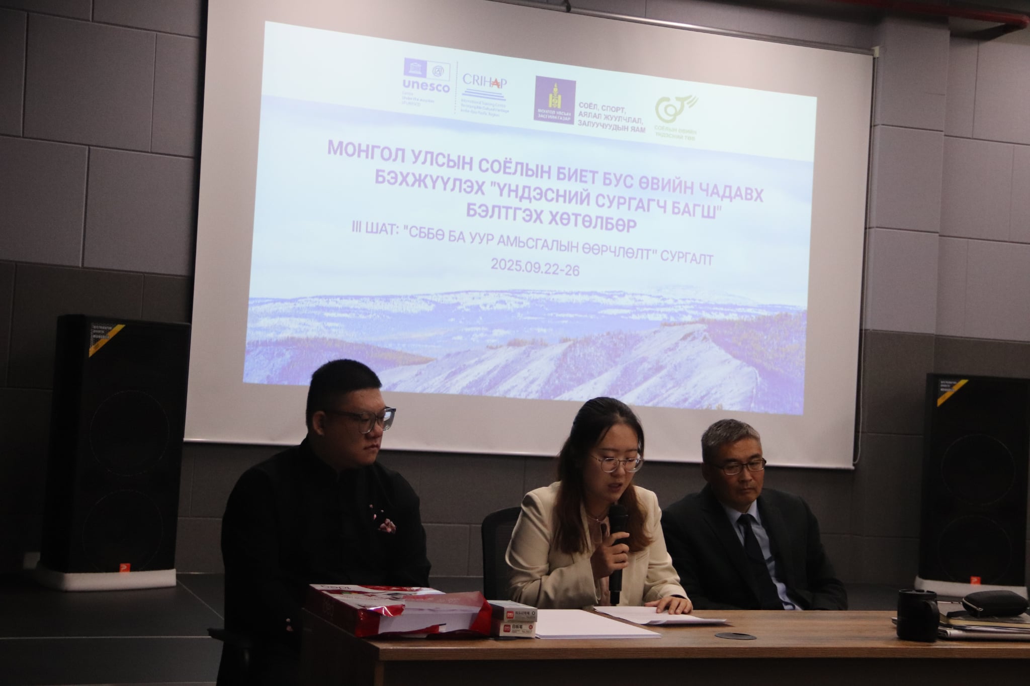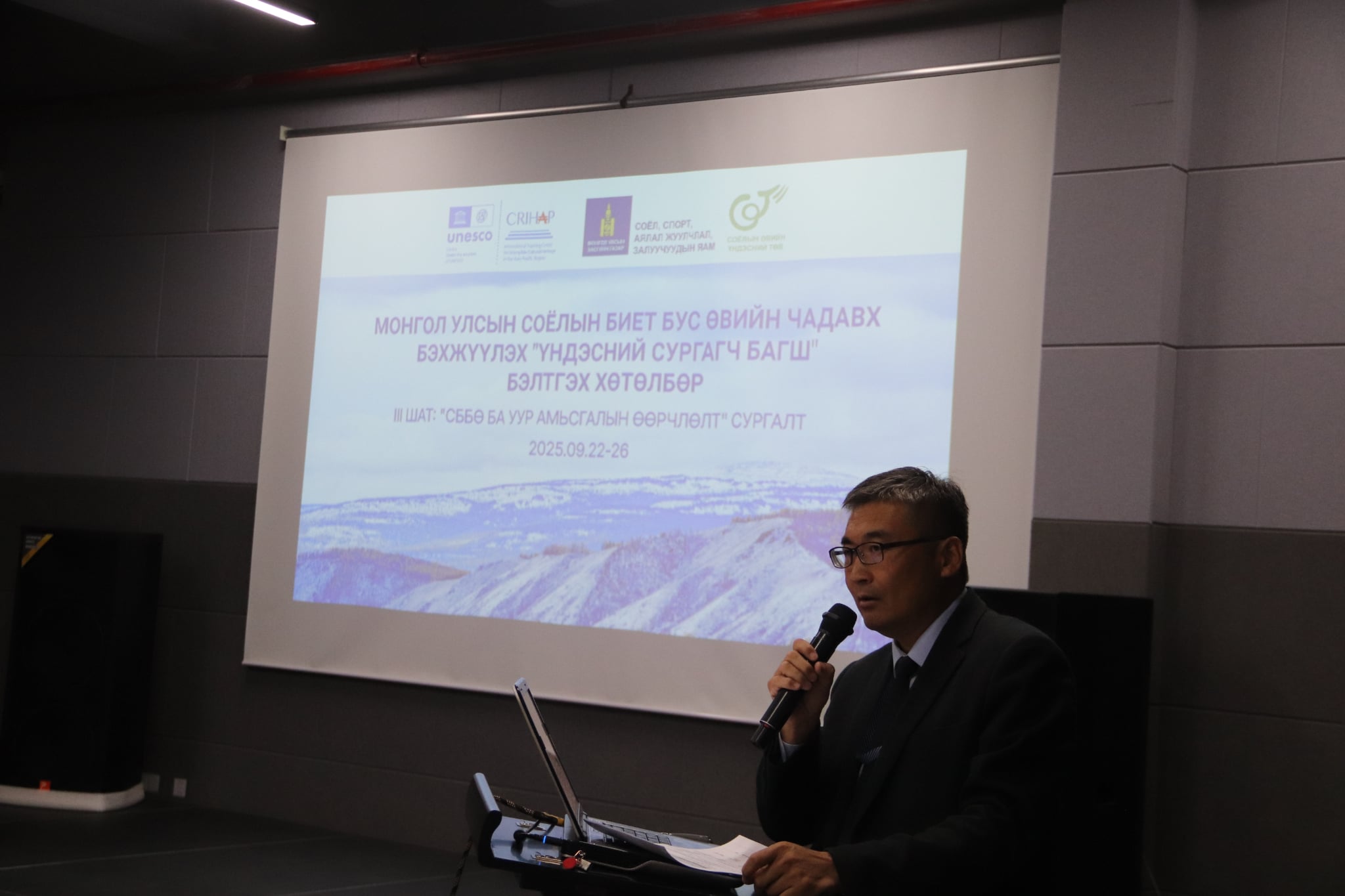 ЮНЕСКО-ийн ивээл дэх Ази-Номхон далайн бүсийн СББӨ-ийн олон улсын сургалтын төв, Монгол Улсын Соёл, Спорт, Аялал жуулчлал, Залуучуудын Яам, Соёлын өвийн үндэсний төв хамтран Үндэсний сургагч багш бэлтгэх чадавх бэхжүүлэх III шатны хөтөлбөрийг 2025 оны 9 дүгээр сарын 22-ноос 26-ны өдрүүдэд зохион байгуулж байна.