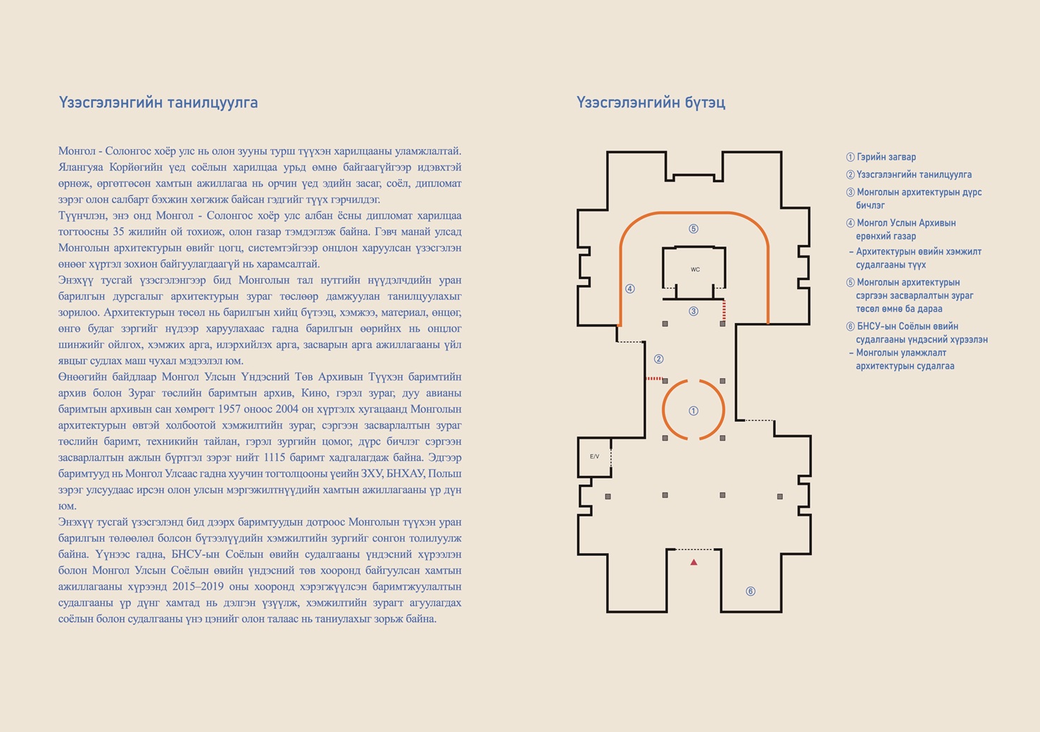 Энэхүү үзэсгэлэнг монгол гэрийн загвар, монголын архитектурын дүрс бичлэг, Монголын архивын танилцуулга, архитектурын өвийн хэмжилт судалгааны түүх, Монголын архитектурын сэргээн засварлалтын зураг төсөл өмнө ба дараа, БНСУ-ын Соёлын өвийн судалгааны үндэсний хүрээлэнгийн танилцуулга, Монголын архитектурын судалгаа гэсэн бүтэцтэйгээр дэглэн Монголын түүхэн уран барилгын төлөөлөл болсон бүтээлүүдийн хэмжилтийн зургийг сонгон толилууллаа.