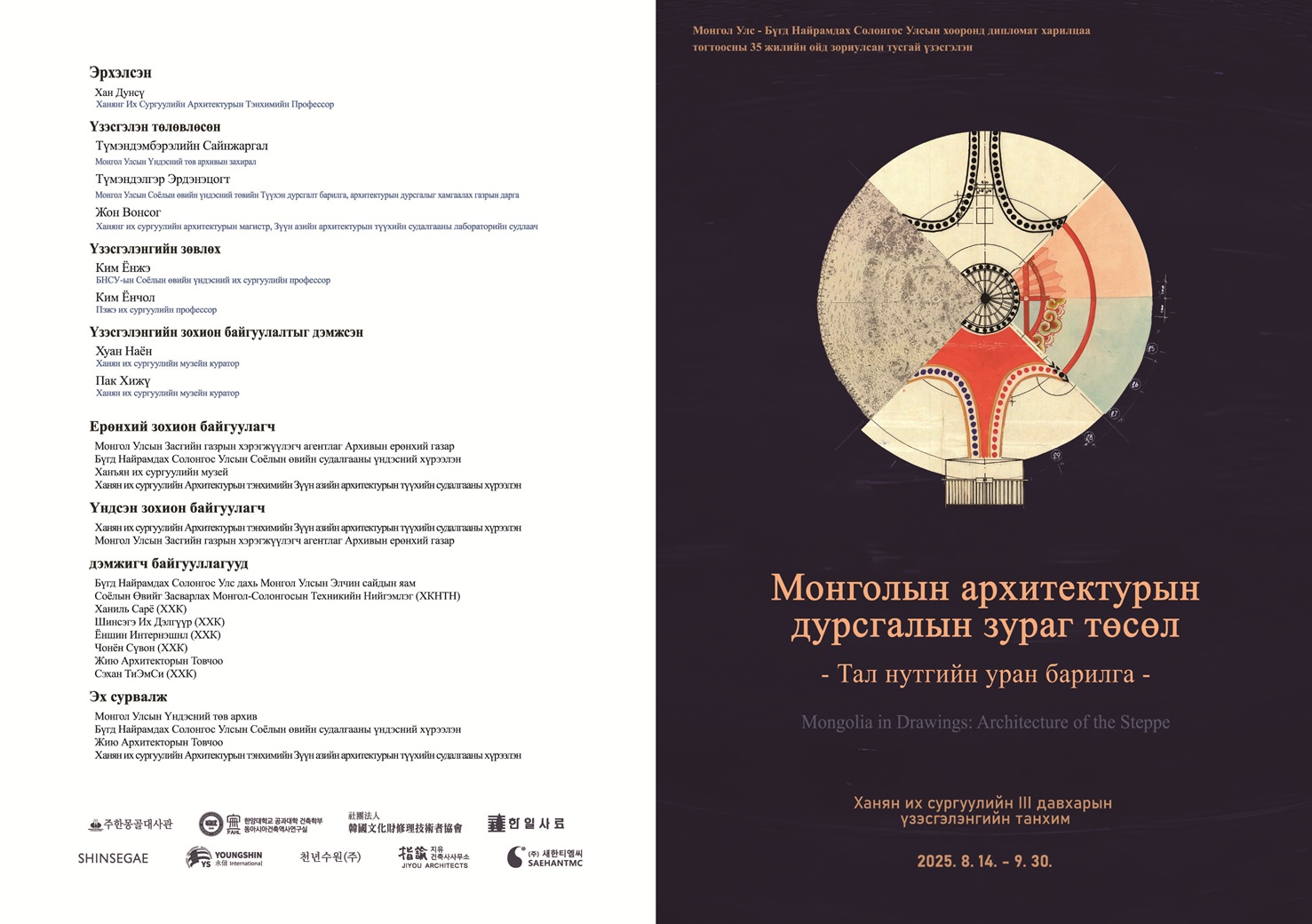 Монгол Улс, Бүгд Найрамдах Солонгос Улсын хооронд дипломат харилцаа тогтоосны 35 жилийн ойг тохиолдуулан Архивын ерөнхий газар болон БНСУ-ын Сөүл хотын Ханян (Hanyang) их сургуулийн Архитектурын тэнхимийн Зүүн Азийн архитектурын түүхийн судалгааны хүрээлэнтэй хамтран зохион байгуулсан “МОНГОЛЫН АРХИТЕКТУРЫН ДУРСГАЛЫН ЗУРАГ ТӨСӨЛ- ТАЛ НУТГИЙН УРАН БАРИЛГА” сэдэвт архивын баримтын тусгай үзэсгэлэнгийн нээлт 2025 оны 09 дүгээр сарын 19-ний өдөр Сөүл хотын Ханян их сургуулийн үзэсгэлэнгийн танхимд болж байна.