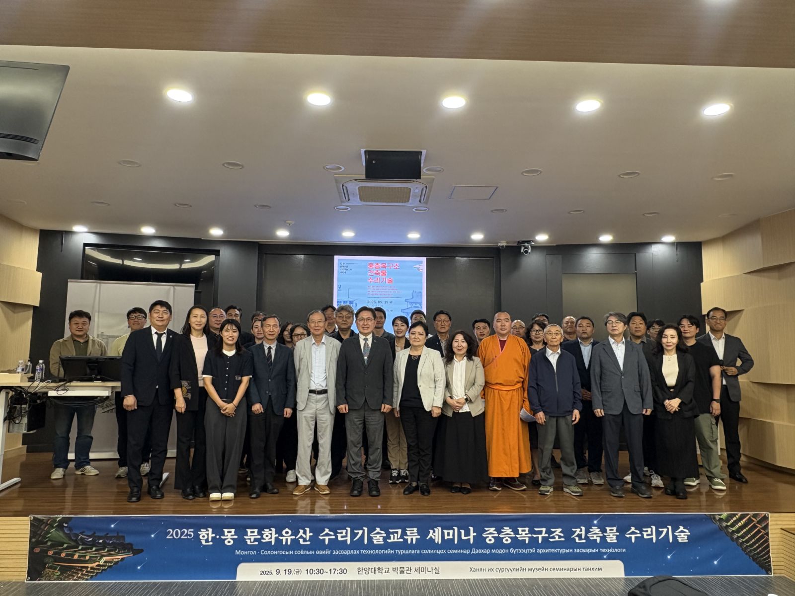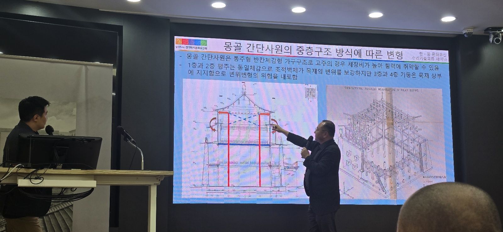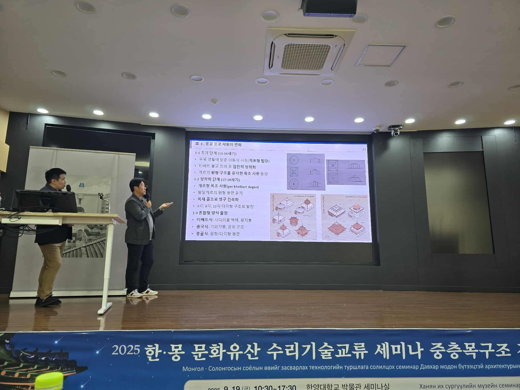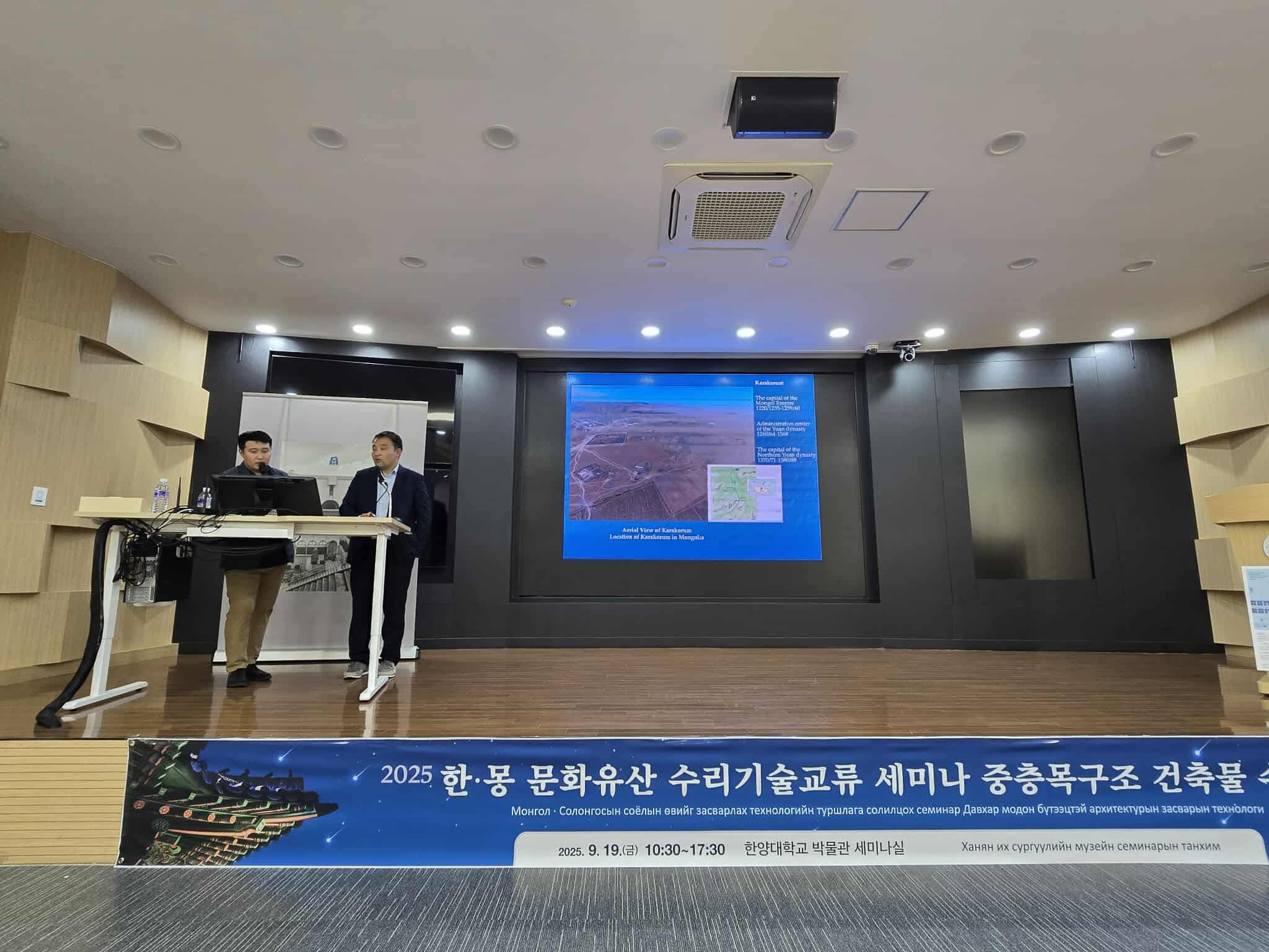 Соёлын өвийн үндэсний төвийн Түүхэн дурсгалт барилга, архитектурын дурсгалыг хамгаалах газраас БНСУ-ын Соёлын өвийн судалгааны үндэсний хүрээлэнгээс санаачлан “ДАВХАР МОДОН БҮТЭЭЦТЭЙ АРХИТЕКТУРЫН ЗАСВАРЫН ТЕХНОЛОГИ’’ сэдэвт Монгол-Солонгосын архитектурын өвийг засварлах технологийн туршлага солилцох эрдэм шинжилгээний хурал 2025 оны 09 дүгээр сарын 19-ний өдөр БНСУ-ын Сөүл хотын Ханян (Hanyang) их сургуулийн музейн хурлын танхимд зохион байгууллаа.
